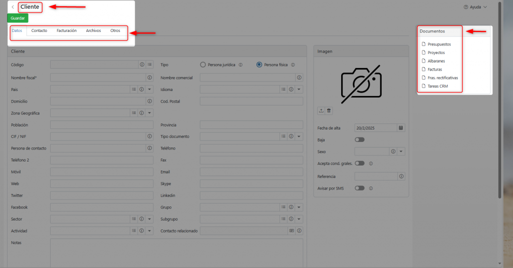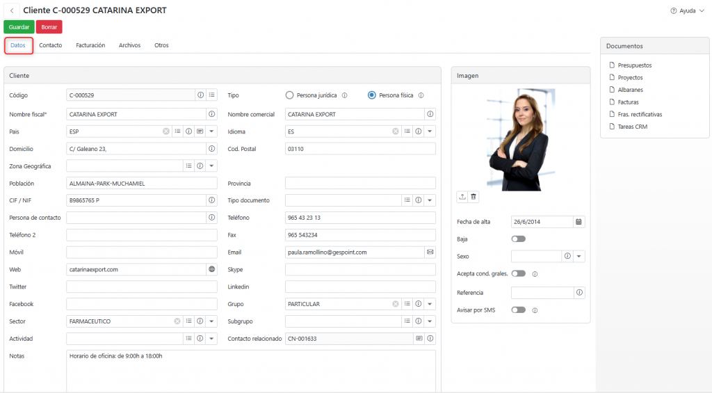 La ficha de cliente se divide en varias pestañas: Datos, Contacto, Facturación, Archivos y Otros.