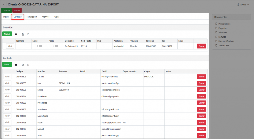 Los datos de los contactos de la empresa se completan en la “Ficha del cliente- Pestaña Contacto”. En ese apartado se podrá completar más de una persona, junto con sus teléfonos y dirección de email.