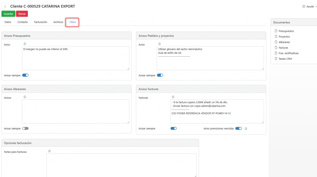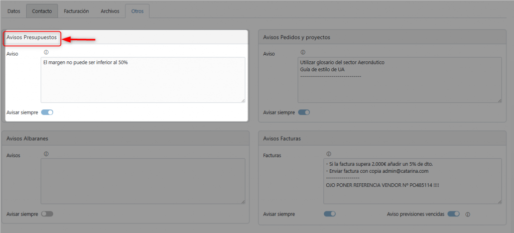Si la opción «Avisar siempre» no está marcada, la notificación solo aparecerá al dar de alta el presupuesto.