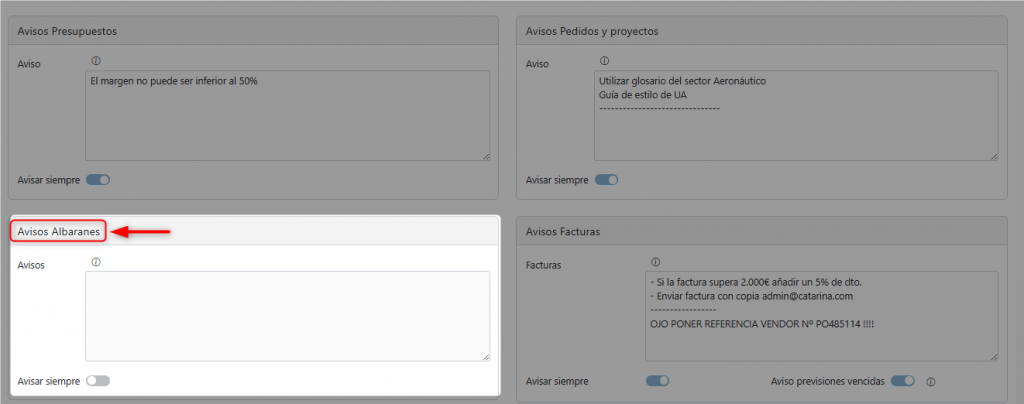 Sección Avisos Albaranes #