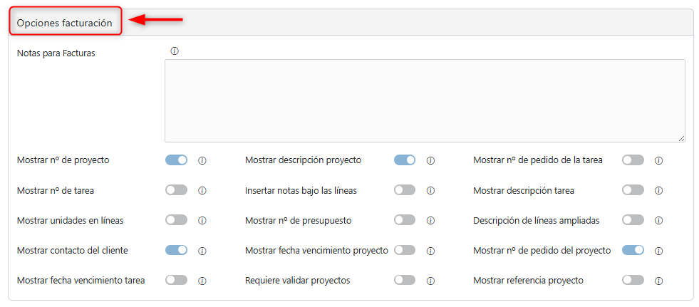 Sección Opciones facturación #