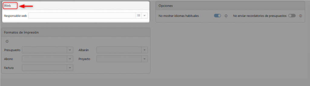 Responsable Web: Esta sección permite asignar a un empleado de la empresa como responsable.