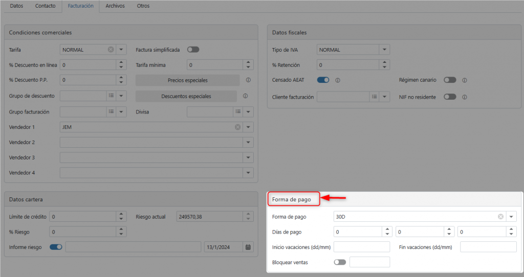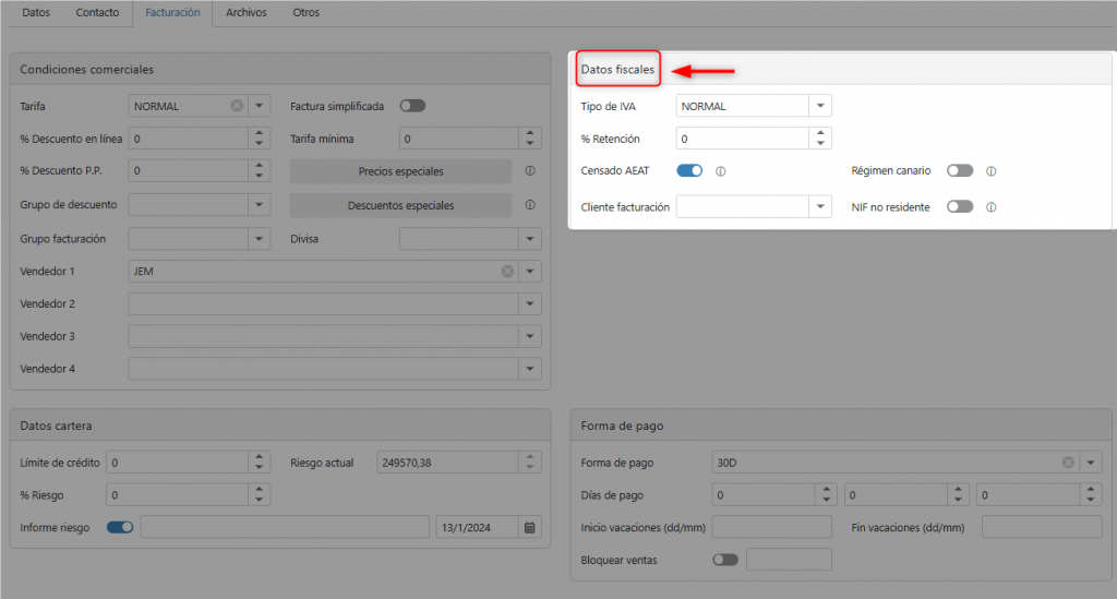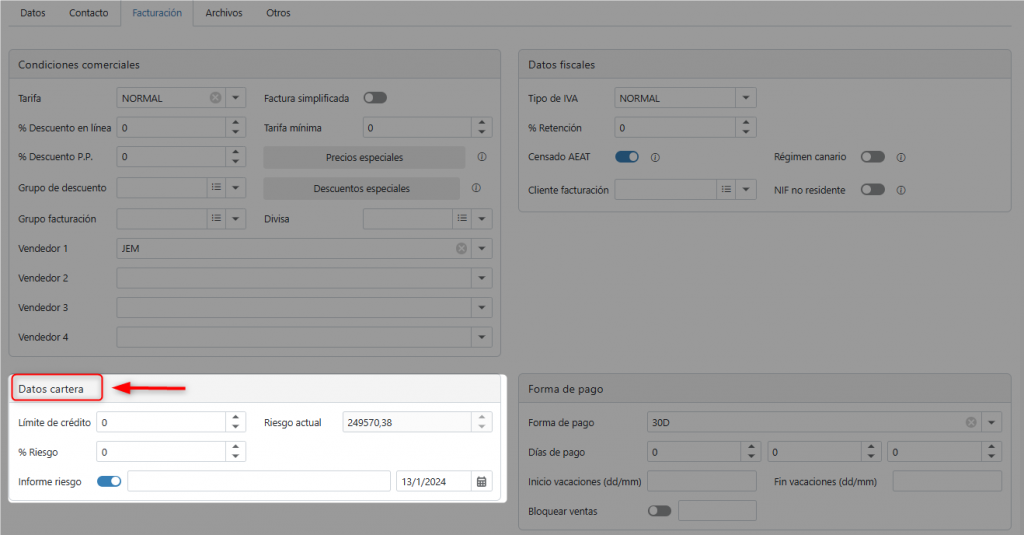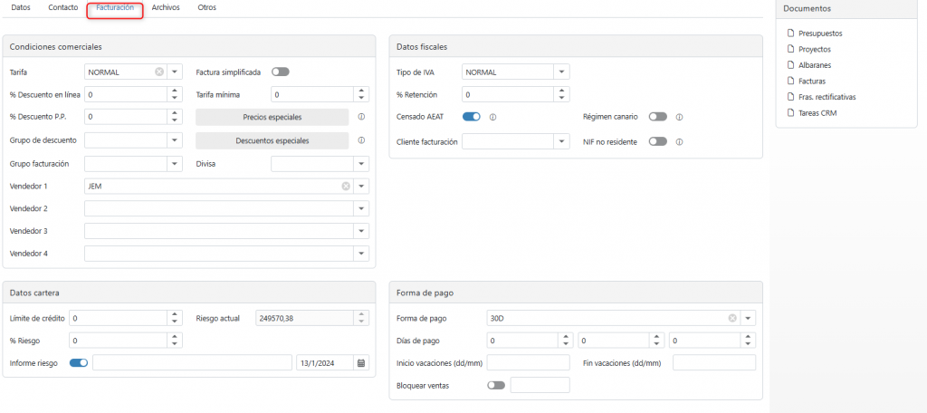 En este apartado se configuran las condiciones comerciales y de facturación del cliente.