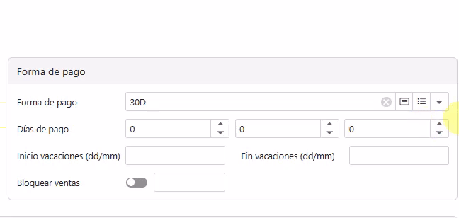 Días de pago: En este campo se pueden establece los días en que los clientes nos pagan. Normalmente son dos. Ejemplo: el cliente nos ingresa los pagos los días 15 y 30 de cada mes.