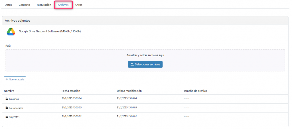Esta pestaña permite subir archivos adjuntos en Google Drive desde Gespoint Billwords.