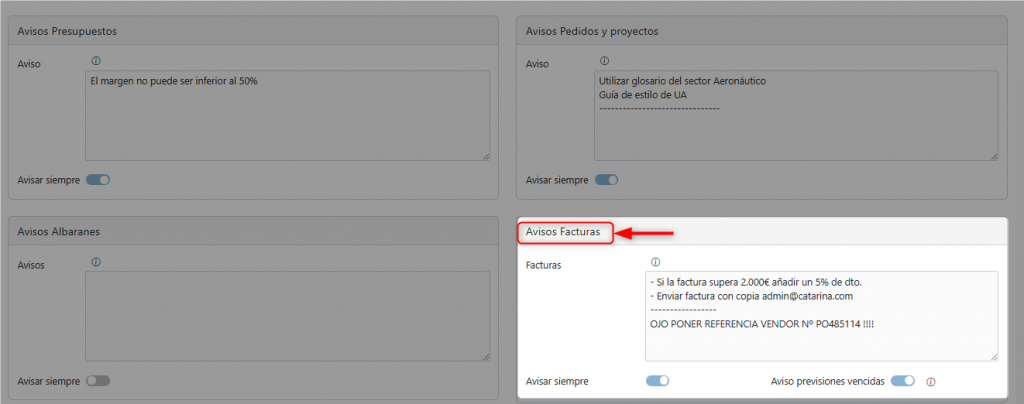 Si la opción «Avisar siempre» no está marcada, la notificación solo aparecerá al dar de alta la factura.